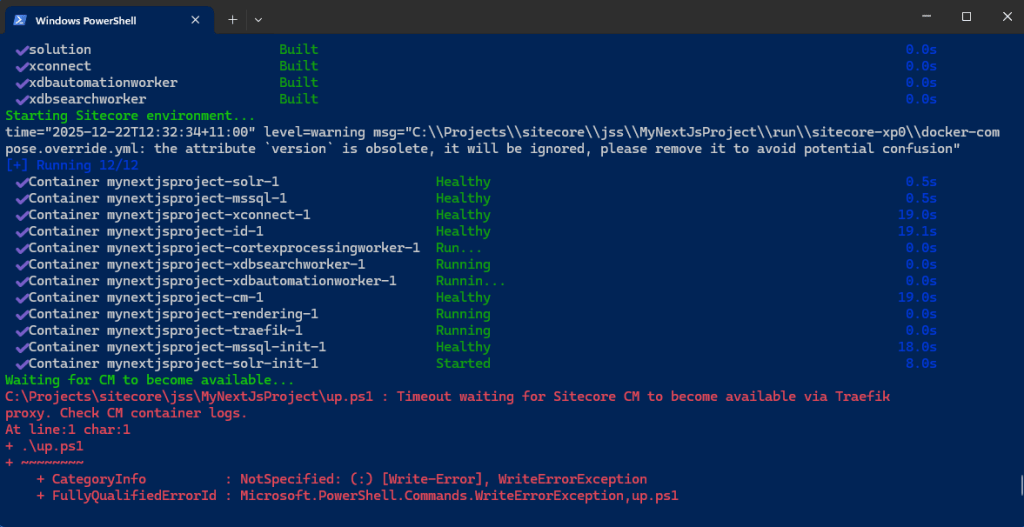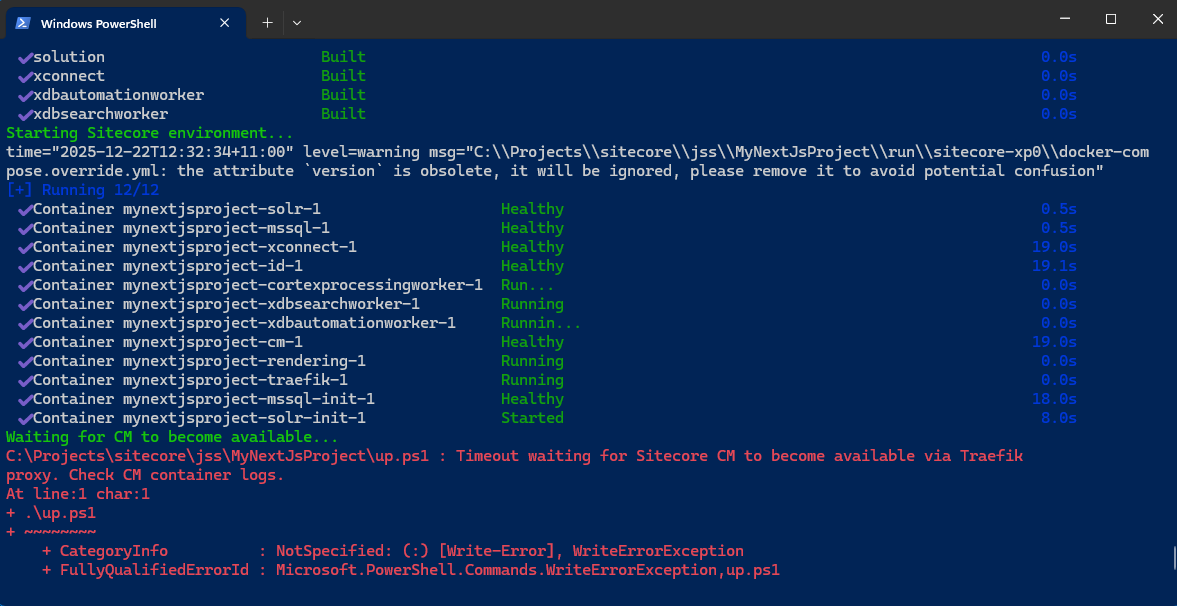 C:\Projects\sitecore\jss\MyNextJsProject\up.ps1 : Timeout waiting for Sitecore CM to become available via Traefik