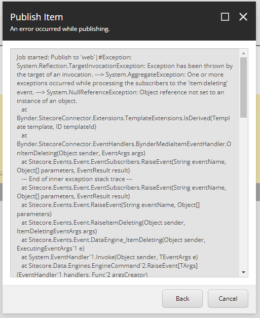 at Bynder.SitecoreConnector.EventHandlers.BynderMediaItemEventHandler.OnItemDeleting(Object sender, EventArgs args)
